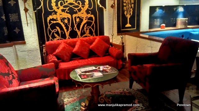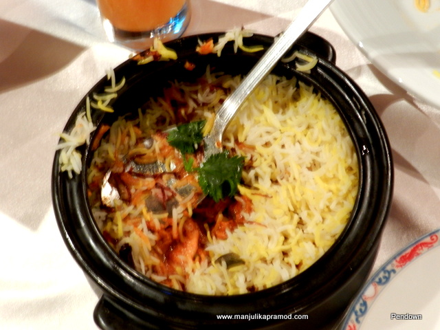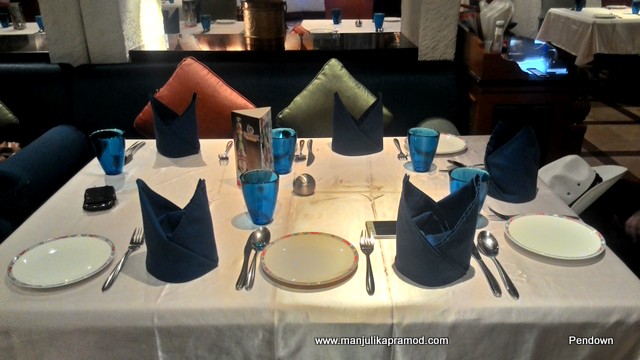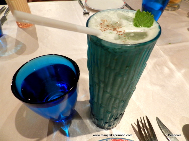 A beautiful door welcomed us in. The blue glasses on the table and colorful wall decorations caught my eyes instantly. Different seating arrangements, comfy combinations of sofa and chairs around the tables occupied most of the dining arena. The ambiance was beautiful, no doubt the Indian-connect happened instantly. In no time we were met by the manager ‘Mickey’ who came around to make us more comfortable. While we settled on our table of six, I went around taking pictures of the restaurant. Our local guide chose to sit on the table next to us. She wasn’t interested in sharing our lavish menu but ordered a Chicken-Biryani for herself. She confessed she was fond of Indian food and loved rice cooked with Chicken. (See her pictures)