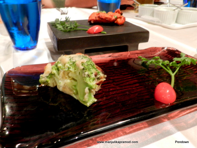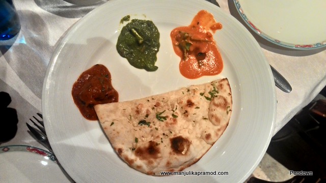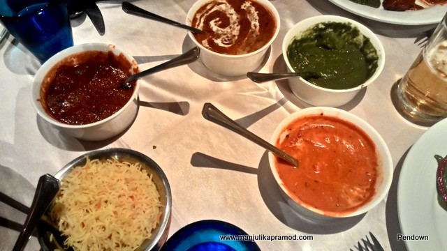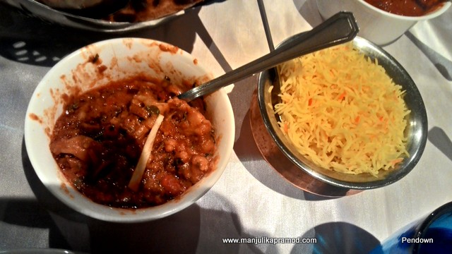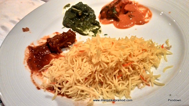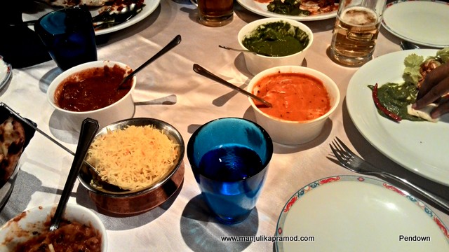 Let me list down the starters. They were –Masala Poppadum, Tandoori Brocolli, Tandoori King Prawn, Paneer Tikka ajwain and Tandoori Lamb chops. Except the prawns I ate all the four items and enjoyed them with my buttermilk for the drink. The Indian flavors oozed out on the taste buds perfectly. We had relished the starters so much that there was hardly much space left for the main course but we gave in to the temptations. Authentic Indian flavors were to be blamed for this.
